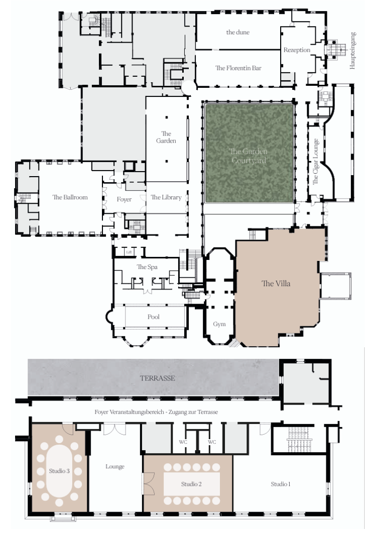 A spacious 245sq m ballroom offers plenty of room for large parties, dinners and events, and impresses with its calm, minimal and warm interior design and ambiance. An adjacent 52sq m foyer is ideal for receptions or as a break-out area. Additional space can be added to any event by extending into the charming 92sq m library.